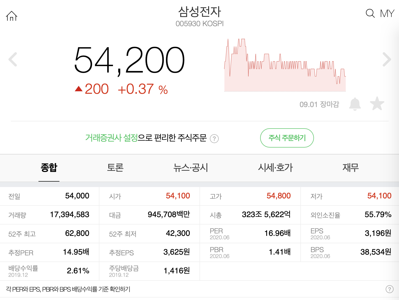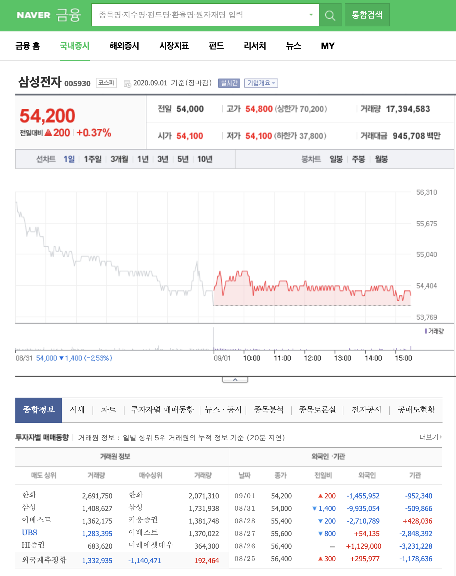 상단 검색에서 '삼성전자'로 검색해보니, 미리 캡쳐했던 모바일 버젼과는 확실히 다른 느낌이다.
