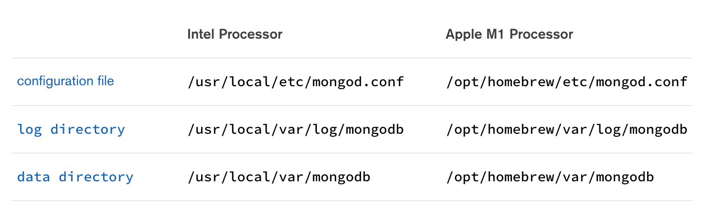 위에 대략적인 가이드 문서를 따라 설치를 진행했지만, mongo 실행 명령어를 못 찾는다. 그래서 다른 사람들은 어떤가 검색해보면 대부분 mongo 명령어를 바로 실행 가능한 것 같고 data 설정을 위한 사용자 설정 등의 단계로 대부분 넘어갔다. 아래 mongodb 가이드 문서에 보면 Intel Processor와 Apple M1 Processor의 경우에 설치 및 환경 구성 경로가 다름을 알 수 있다.