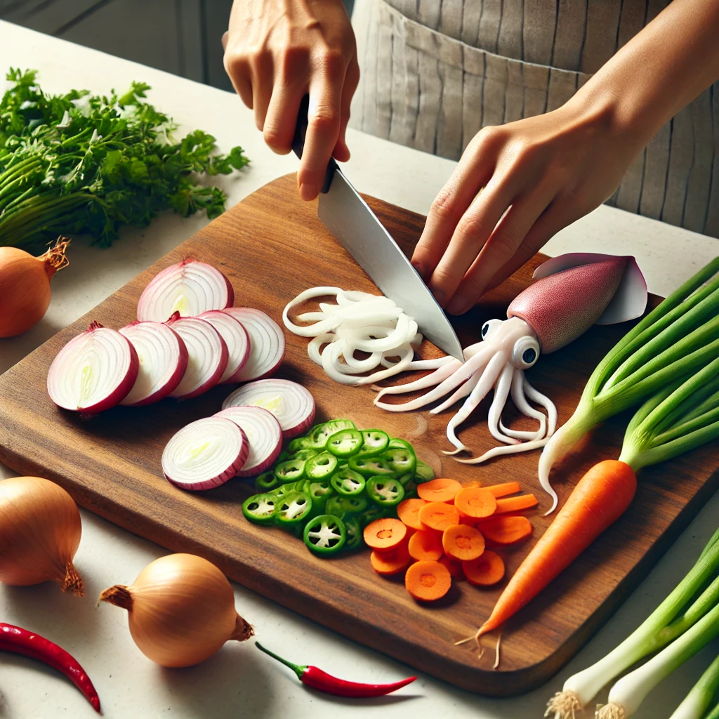 - Cut the squid into bite-sized strips, and slice the tentacles into 4-5cm pieces.