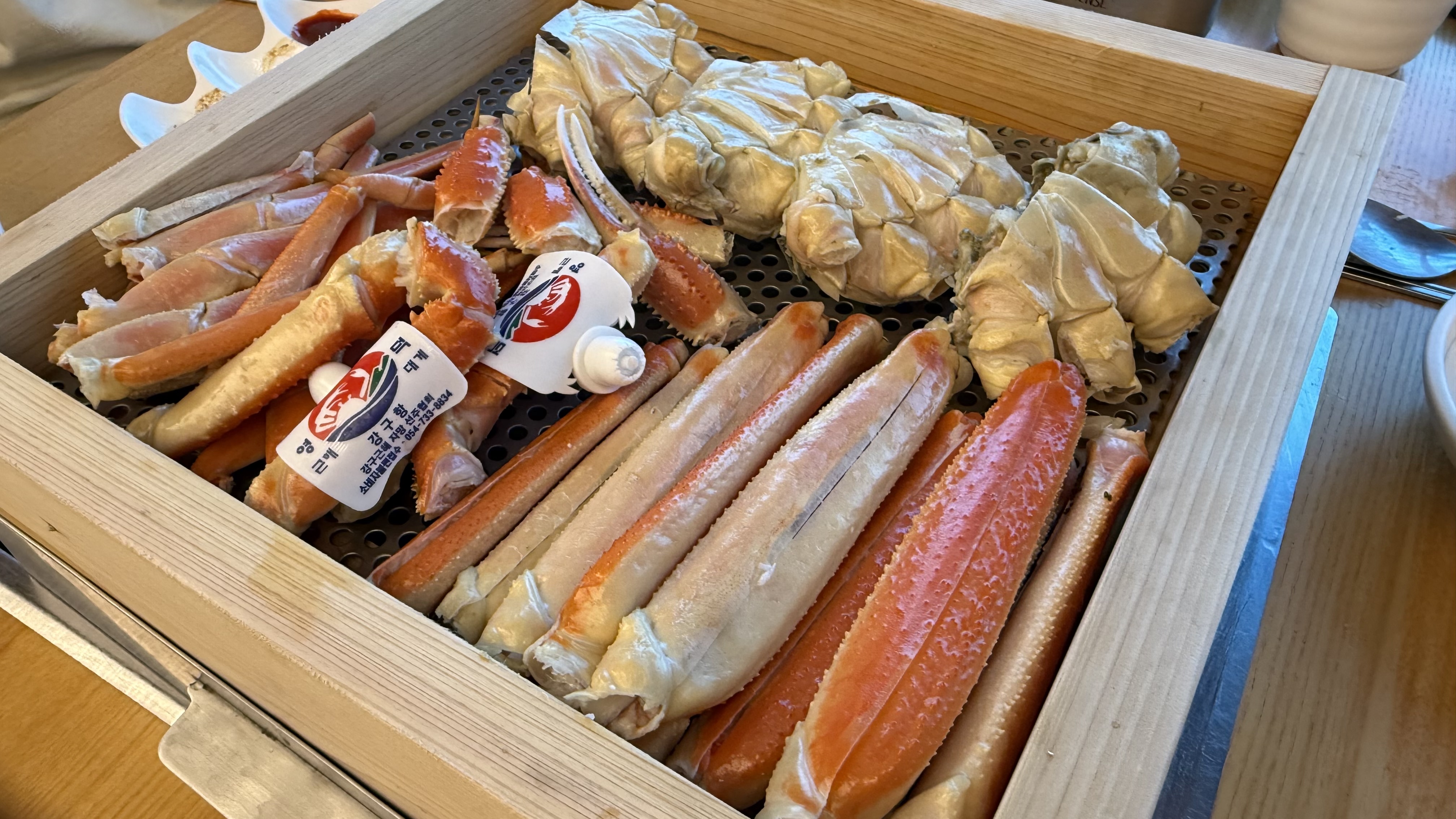 - 구성: 전복죽과 샐러드 → 회를 포함한 각종 해산물 → 게다리 치즈구이 → 대게찜→ 홍게라면 → 각종 튀김 → 과일로 이어지는 코스형 식사 제공